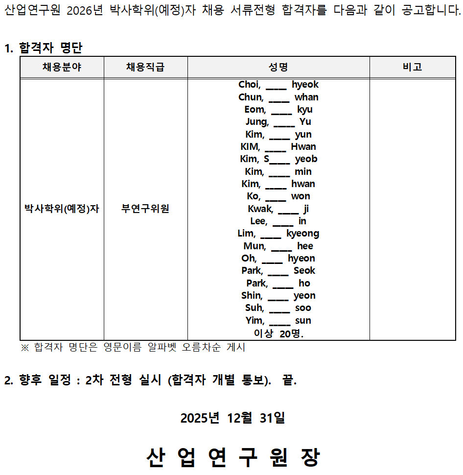 2026년 박사학위(예정)자 채용 1차 전형(서류심사) 합격자 공고