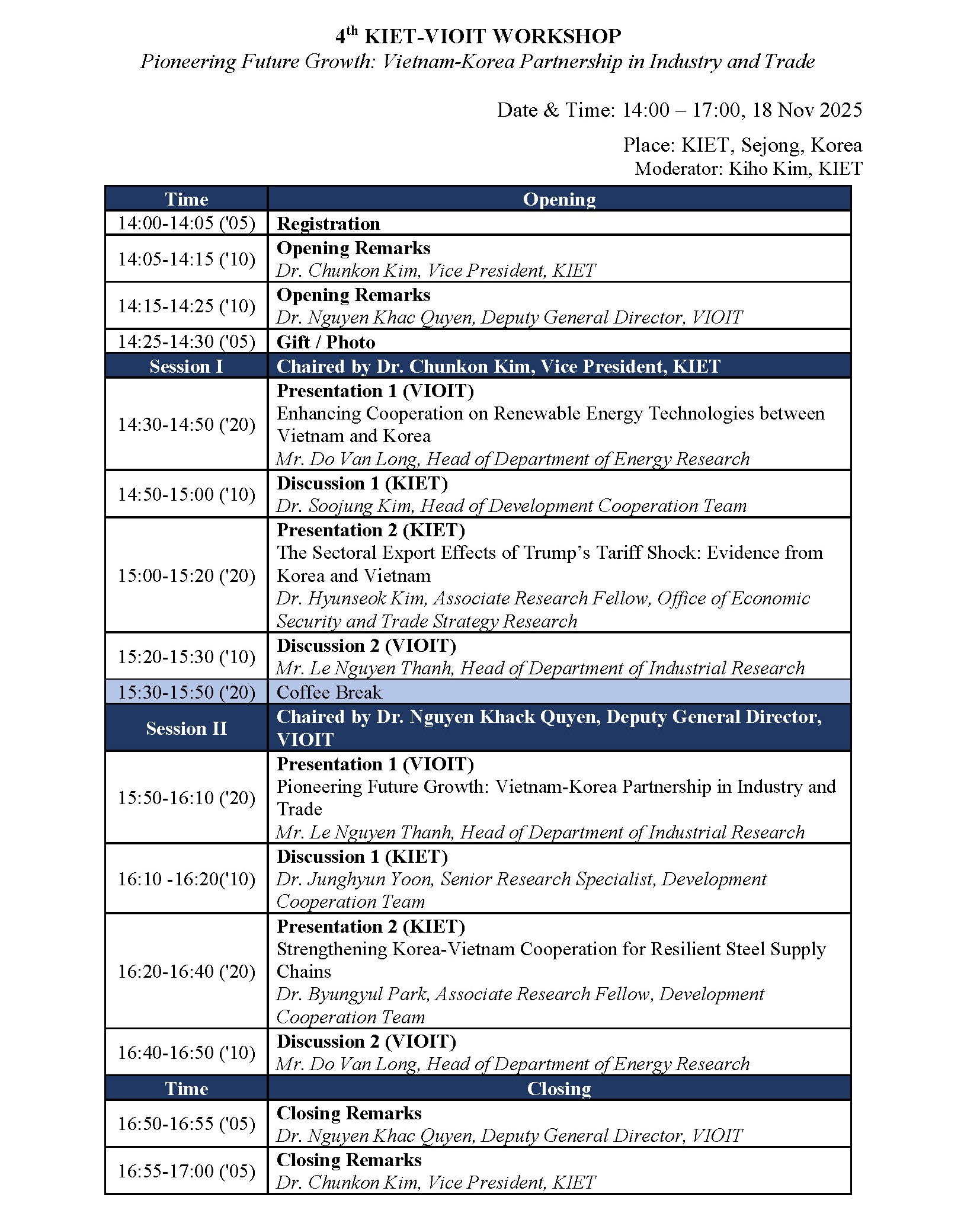 산업연구원(KIET)는 2022년 베트남 산업무역정책전략연구원(VIOIT)과 체결한 MOU에 따라 11월 18일 한국 세종에서 제4차 공동워크숍을 개최했다. 이번 워크숍은 “Pioneering Future Growth: Vietnam–Korea Partnership in Industry and Trade”를 주제로 양국 산업·무역 분야의 협력 방향을 논의하는 자리로 마련됐다.